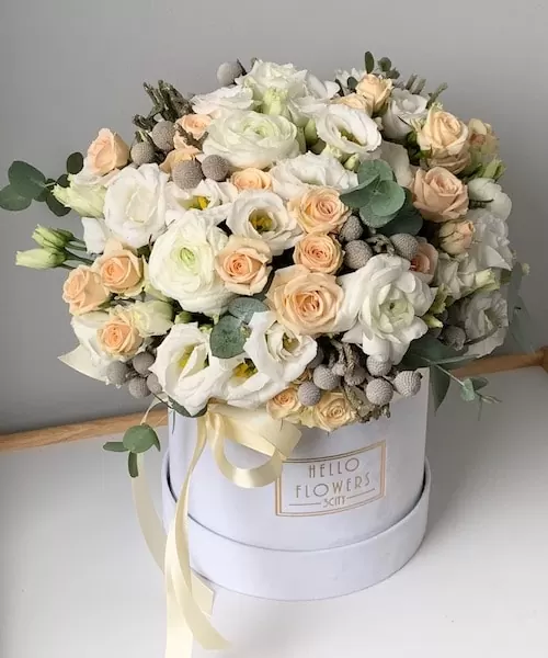 A big round box covered with white velor material is our new PREMIUM collection. In a set with fresh eustomas, buttercups, branch rose and additions in the form of brunia and eucalyptus, it will impress the recipient both in terms of appearance and wonderful fragrance.