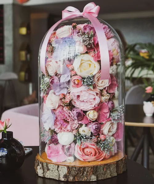 A composition of artificial flowers made on a wooden trunk and covered with a glass shade.